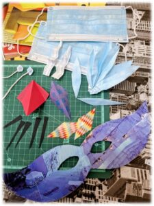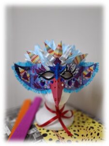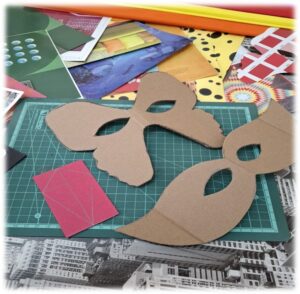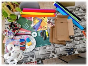 1. אוספים חומרי יצירה שונים. אפשר להשתמש בחומרים קנויים: ניירות קרפ, סול מנצנץ, מדבקות. אפשר למצוא דפים צבעוניים מעיתונים בבית וקרטונים שונים ומהם להתחיל. אפשר אפילו להשתמש במסכות רפואיות. מספריים, מהדק סיכות, דבק סטיק, עפרון וטושים.