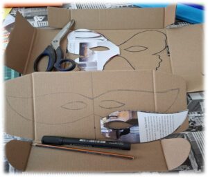 1. אם יש מדפסת, אפשר להדפיס דוגמה של מסכה, או לצייר, ולגזור מסביב. אני מקפלת תמיד את הנייר לשניים וגוזרת כך שהצדדים שווים.